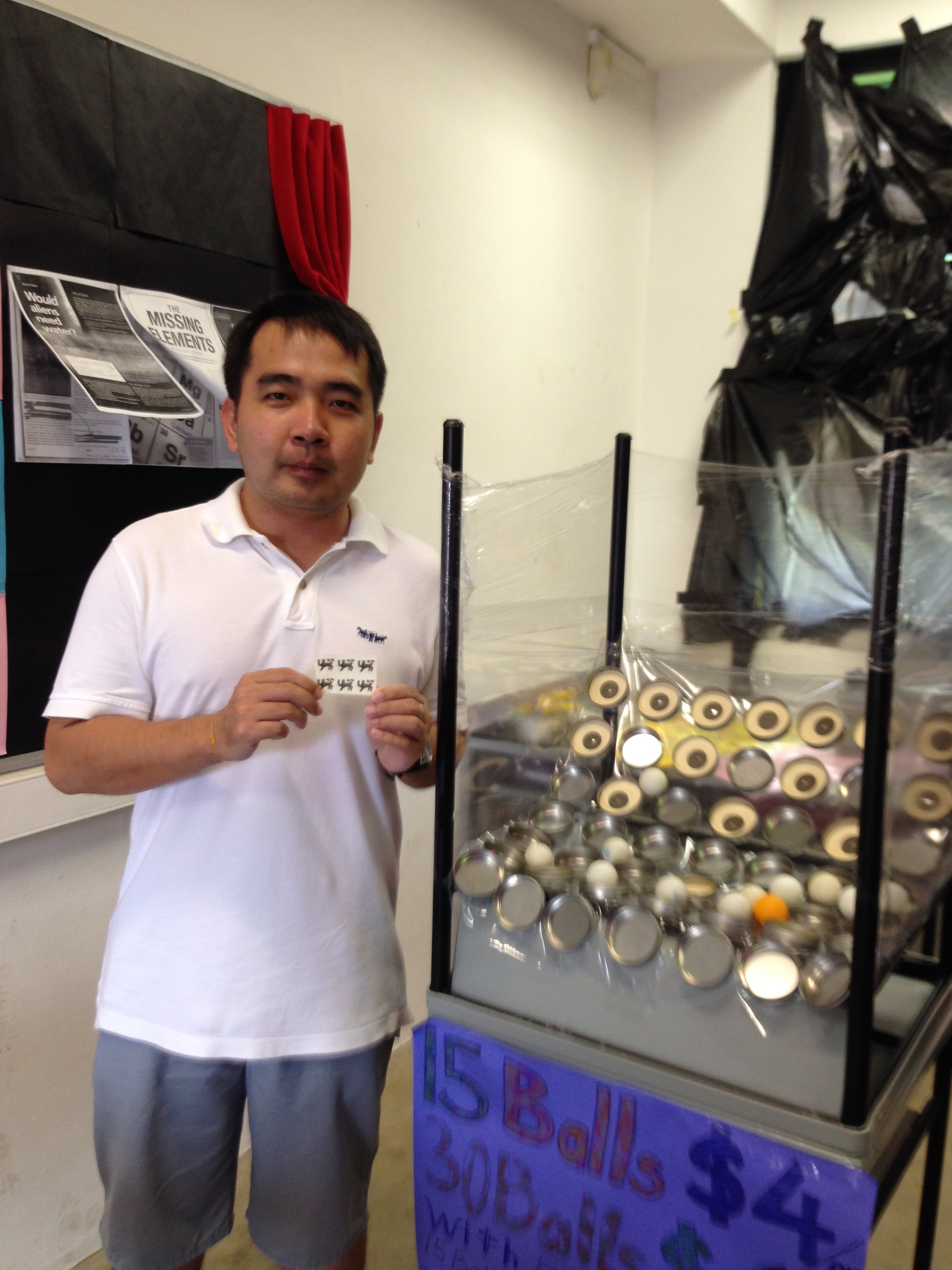 We left Funtasia with 3 balloons and lots of fun. Oh yah, the 3 balloons. We were quite serious about winning some prizes home. So, we took a piece of the sticker form, and strived to win as many stickers as possible. At the station above, where we were supposed to throw ping-pong balls into these small circles, we won 14 stickers at one go. We won 2 more at a separate station, where we had to roll a ball up and down card-boards before ending up in the indicated card-board box. Oh, we didn’t manage to get any ball into the box. The station-master just took pity on us and gave us 2 stickers. Haha.. 🙂 Yah, so we were quite smug with our 16 stickers and wanted to exchange for some prizes. At the prize exchange booth, though, they have run out of prizes. So, we asked for the 3 balloons instead with the intent of giving them to Amber.