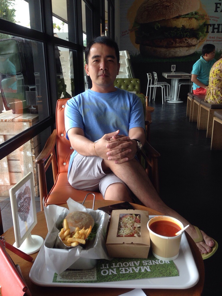 Today, we didn’t have lunch till 2pm plus, mainly because I had to go back to office to finish up my work. Both our stomachs were growling by the time I reached honey’s home. So, we decided to go to turf city. We first had crackling roasted pork and honey roast at Pasarbella. Don’t get me wrong. I didn’t roast honey. She is too precious to me. Furthermore, she has no fats, so she won’t taste good. Ok, before she bites me, I better stop. After that, we searched for this restaurant that serve vegan burgers. We were lost initially, but with honey’s acute sense of direction, we finally found it. Key takeaway for me: we might get disheartened mid-way through our journey, but we should never give up, because we will eventually reach there, as long as we let our love guide us. 🙂