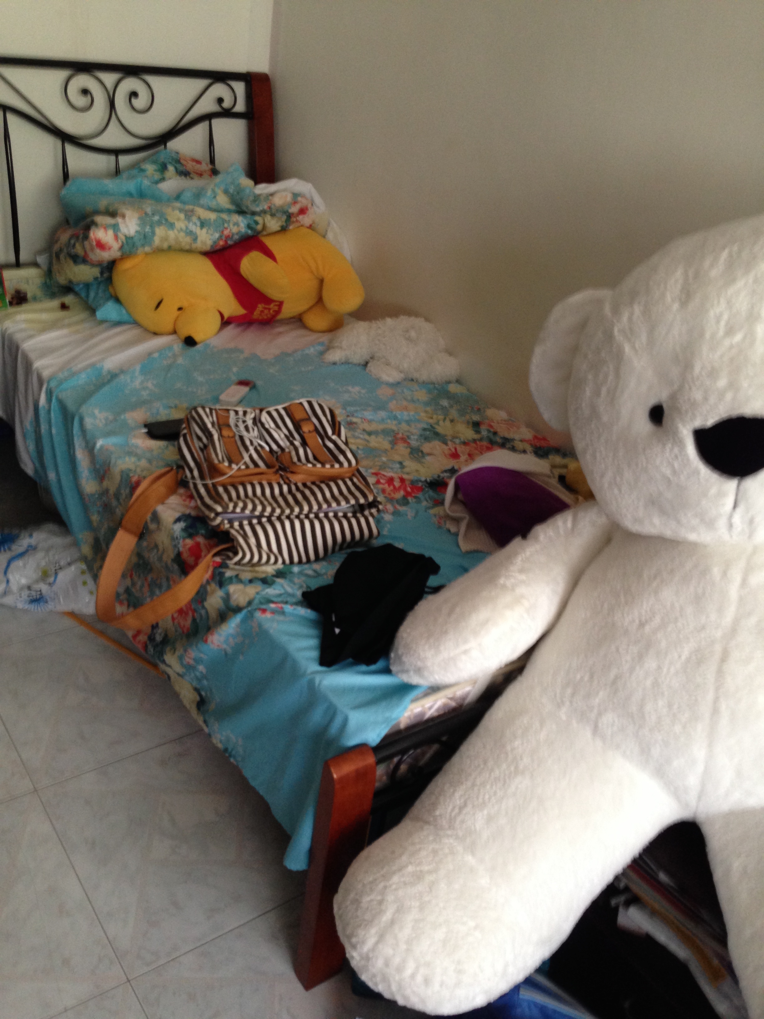 Normally, I would post about an event or a day that honey and I have shared memories of. But, today, sitting on honey’s bed, an inspiration leaped out at me to have a post dedicated to the sanctuary of my honey. This is the room that has given honey lots and lots of good night sleep. This is the room that is our fellow conspirator every night when we talk on the phone, keeping honey’s voice trapped inside the room as best as it can. This is the room that provides peace and focus to honey when she needs to rush through homework and office work. This is the room that lets honey see the reflection of herself everyday after she has changed to see if she is ready to step out and face the world. This is the room that gladly opened its arms and welcomed Winnie and XiaoPing into its fold, letting them stay happily in it. This is the room that willingly allows honey’s clothes and stuff to be strewn all over it, because it doesn’t place its look as first priority, but honey’s busy schedule and precious few moments of sleep as top priority.